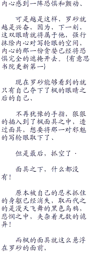 带着轮回的面具,不知道枫现在的表情如何,不过那冰冷而又冷静的容颜,恐怕现如今没有一个人能够让他发生变化吧!