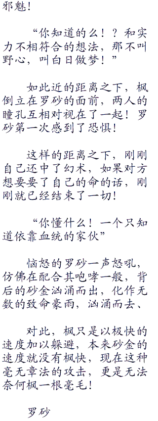 朝着罗砂毫无所谓的勾了勾手指,做出了一副尽管放马过来的架势,嚣张的语气完全不符合枫的性格。