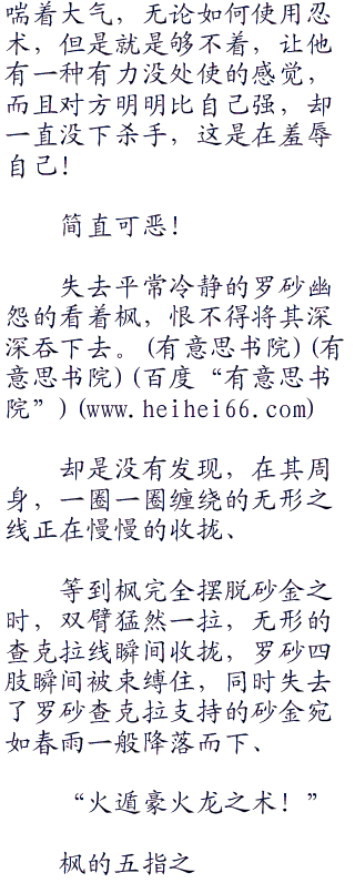等再一次听到罗砂的声音的时候,他已经来到了的枫的背后,被操纵的四肢被罗砂的砂金完全的控制,他刚刚明明使用了忍术,虽说对枫没有被大卸八块有些震惊。