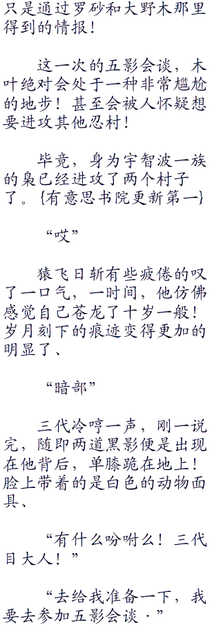 不寻常的气息开始弥漫开来,除了砂影的罗砂之外,其余的三影都对此表示怀疑!