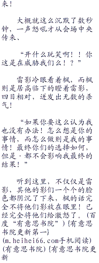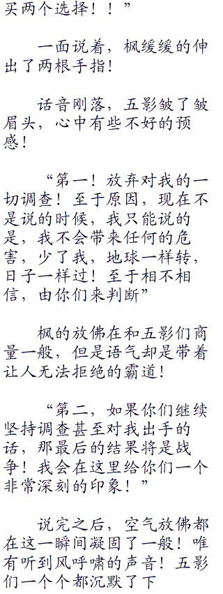 雷影挑了挑眉毛,怒眼瞪着枫,他是再让枫解释为什么来到这里的,但是这哪里是解释!