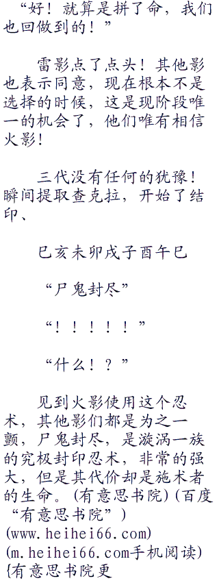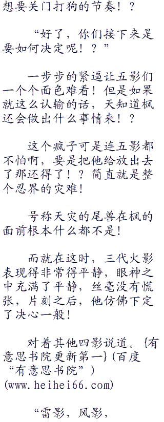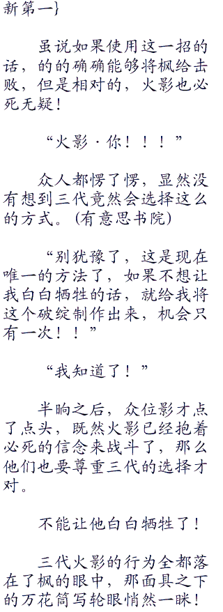同时,不详的诡异火焰悠然而生,方圆数千米之内将枫和五影完全的囊括进入,而降护卫们一个个隔绝开来,不想让他们碍事。