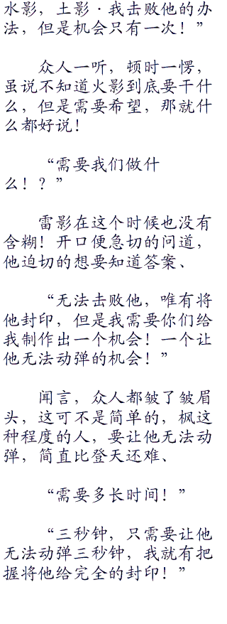 枫那邪恶的万花筒写轮眼平静的望着下方的五影,眼神之中看不出有丝毫的波澜!