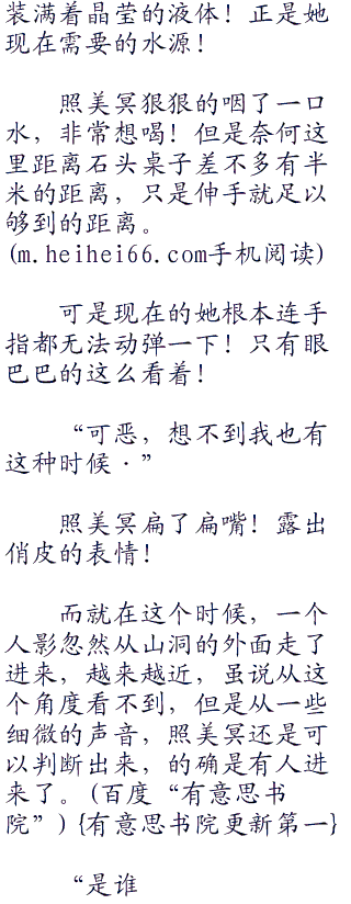 照美冥转动唯一可以移动的脑袋,四处张望着,这才发现,原来她现在正身处一个山洞之中,山洞并不是很大,差不多十多平方米的样子。