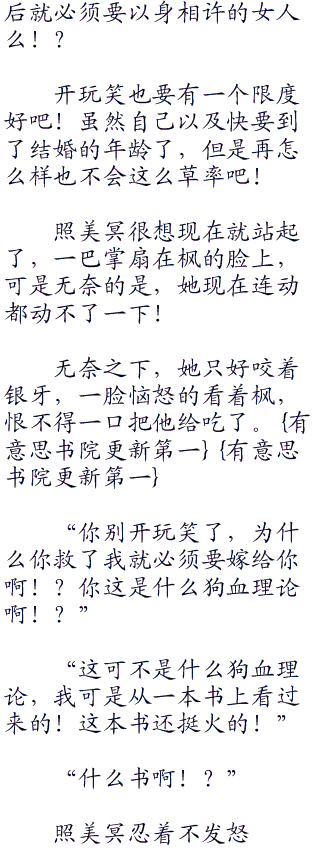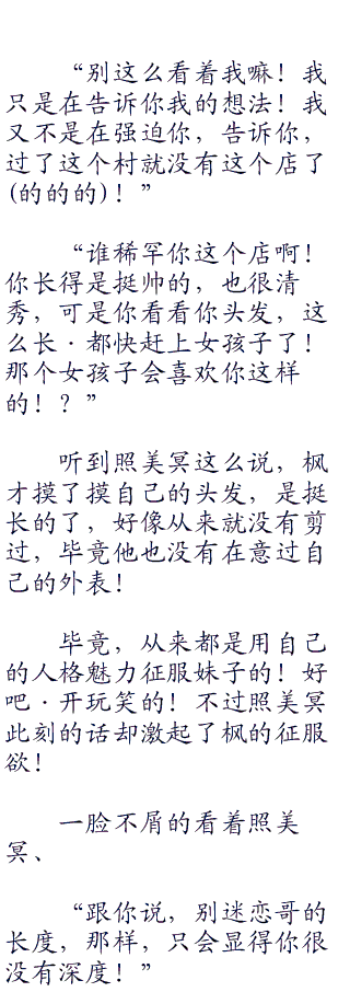 “怎么!?一直叫我美女不行么!?有那个女人不希望别人叫自己美女呢!?特别是像你这样的帅哥!”