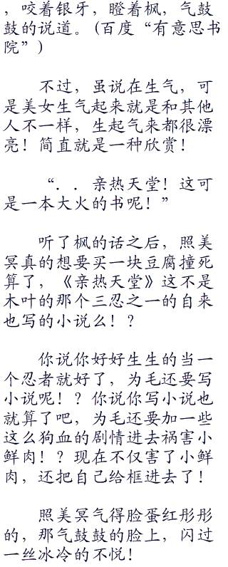 照美冥露出笑容问枫,不过,那个笑容,不管怎么看都让人瘆的慌!