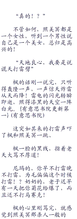 照美冥眼睛微微一眯,上下打量着枫,似乎对枫的话表示怀疑!