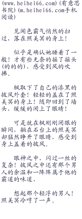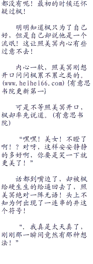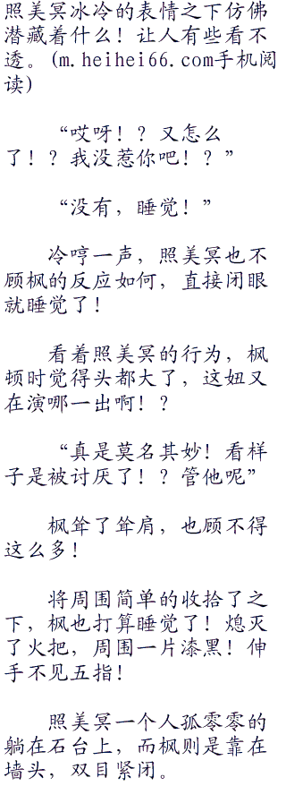 照美冥懒得理枫了,她们一天之内斗嘴也不是一次两次了,可是不管哪一次,吃亏的总是自己!这让照美冥纳闷得不行!