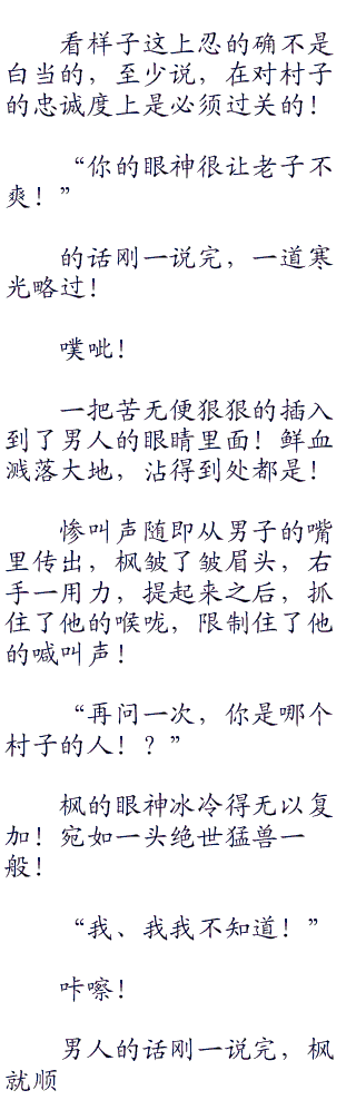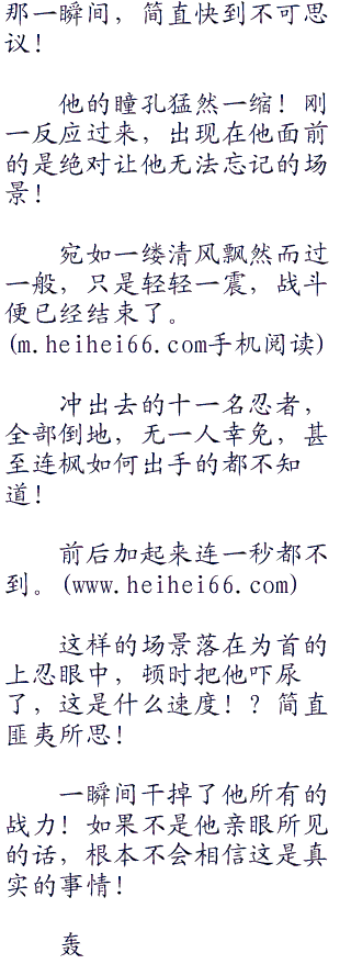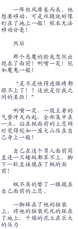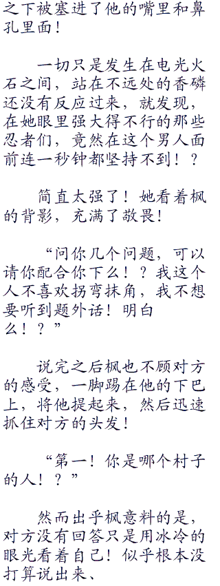 枫的话还没有说完,对方的首领就忍不住瞳孔一缩!面对一个不知道等级的忍者,身为上忍的他不会有任何的大意。