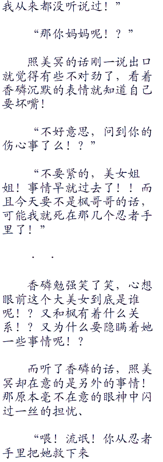 枫推了推香磷,想让她和照美冥搞好关系,香磷显得有些羞涩,或许只是有些不适应这种事情吧!?