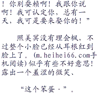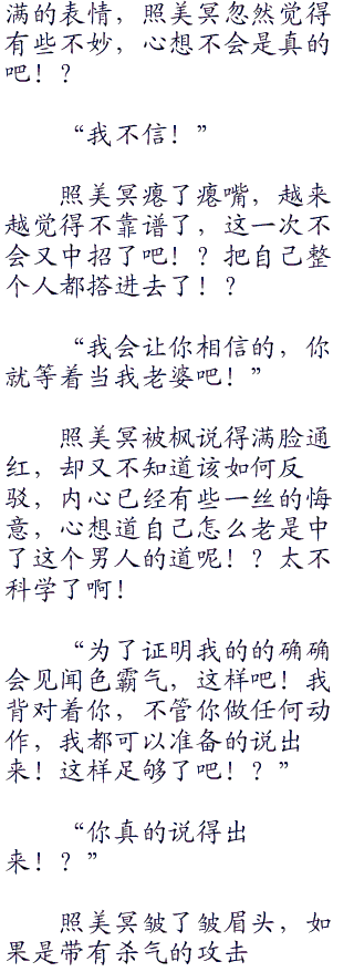 照美冥瞪了枫一眼,觉得枫是越来越不靠谱了,真不知道自己对他有好感是怎么来的!?真是气死个人!