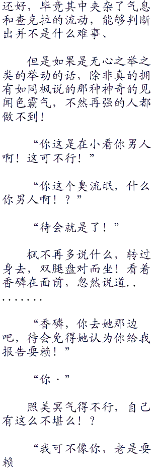 无奈之“三三七”下,香磷只好退出了这两个冤家的吵嘴当中,在旁边默默的当起了观众、