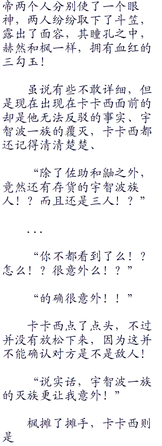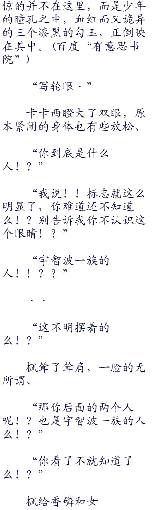可是迎面而来的却是一个邪魅的瞳孔,那是他从未见过的瞳孔!血红而又邪恶的查克拉,让人生畏,构成了一个不知名的魔法阵!
