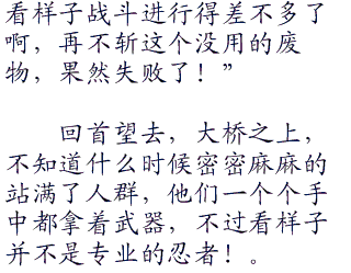 雾隐悄然的散去,露出了三人的身形,在大桥的外围,小樱保护着达兹纳老头子,鸣人在查看佐助的情况!