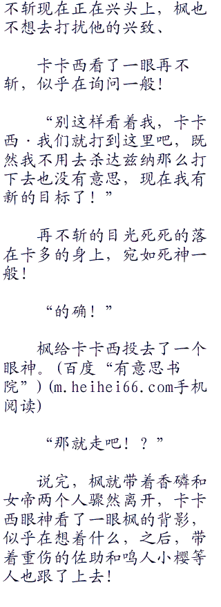枫再看了一样被白被背在背上的再不斩,算算时间,三分钟差不多要过去了吧!