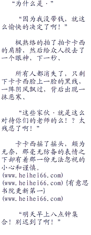 不知道为什么,卡卡西选择了放弃,或许是在和枫对视的时候气势完全处于下风的缘故,又或许是他发现了枫的眼神中夹杂着其他的什么东西了吧!