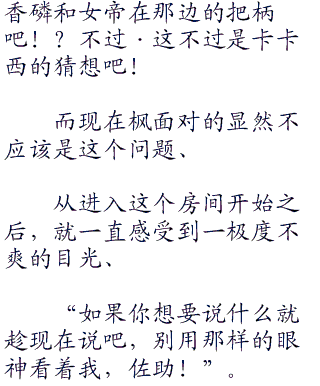 眼神忽然变得凌厉起来,卡卡西皱了皱眉头,盯着枫,半晌之后,忽然才摊了摊手、