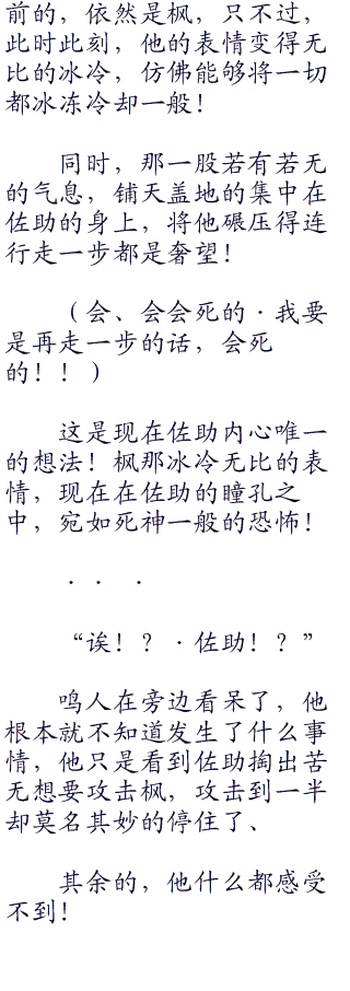 佐助的眼神和气息显得无比的冰冷,把旁边的鸣人吓了一大跳,自从他认识佐助以来,他还是第一次看到这个样子的佐助!