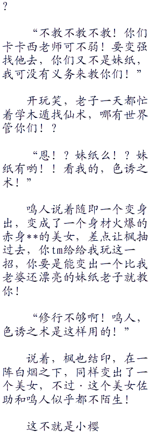 枫放声大笑,充满了鄙夷和嘲讽!佐助死死的紧捏着拳头,指甲都陷入了血肉之中。