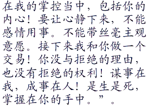 “交易的最为成功的地方就在于能够拿出让对方满意的筹码,这是一个非常现实的事情,在我的面前,所有的一切都将合理化,哪怕是死神·也是如此!”