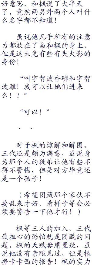 说完之后,卡卡西便推门而入,看样子三代和枫的谈话已经结束了,至于内容,他不会去过问,那是火影才应该担心的事情!