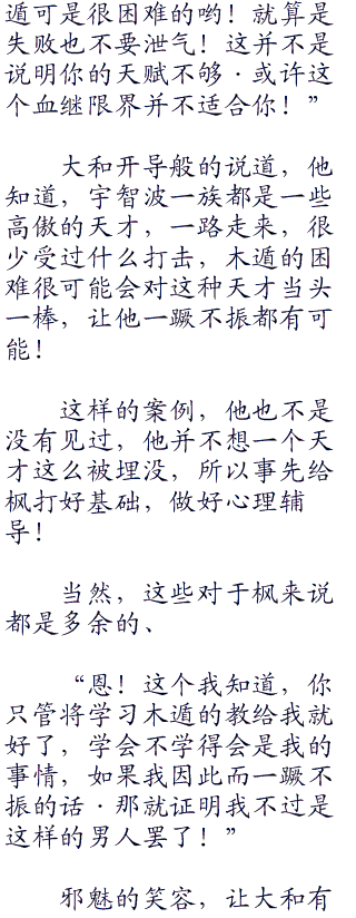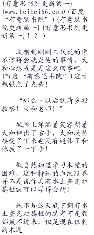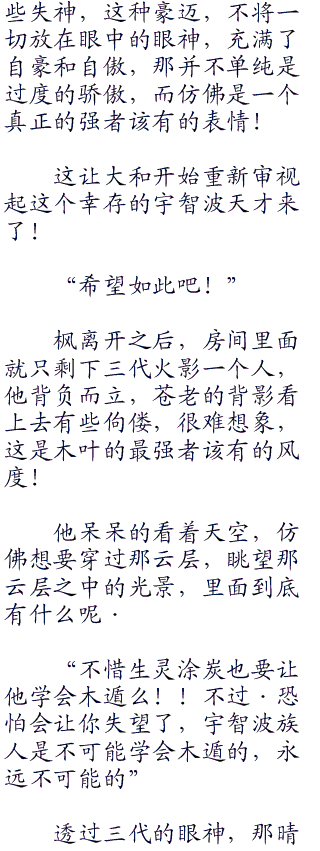 枫怎么不知道三代的这些想法,只是没有点破罢了!说到底,枫只是在完成自己的目的罢了,通向巅峰之路没有捷径,只有变强变强,不断的变强一条路可以走!