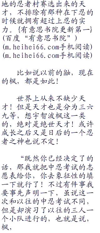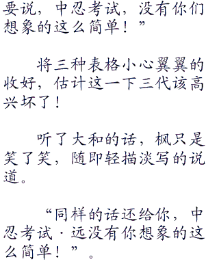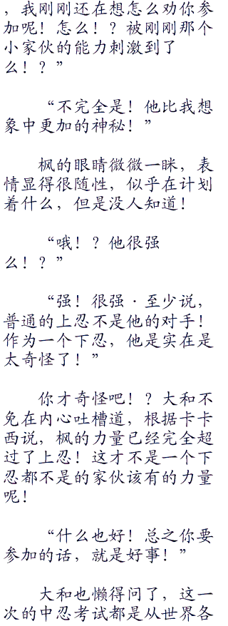 “不知道你是心高气傲还是完全没有把这一次的中忍考试放在眼里,但是,有些人可是很看重的哟!”