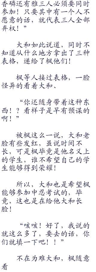 以枫的优秀程度,三代绝对会想方设法的想要让枫参加,要是枫不参加的话,大和才难办呢,毕竟现在,他可是枫的带队老师。