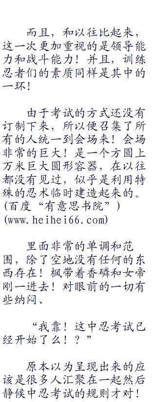 这一次的中忍考试和原著当中的并不相同,原著当中是先是笔试,然后在实战,而这一次不同,会有全新的规则和方式、