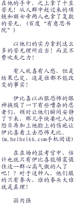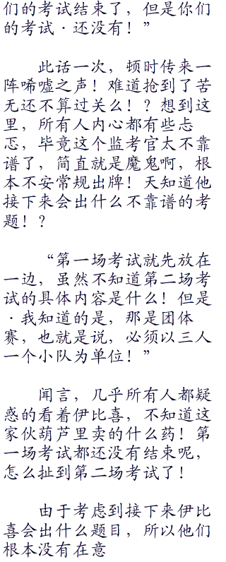 考试是残酷的,犹如战场,在这里,没有同情心!因此,在全力的抢夺苦无的情况之下,各处地方都持续爆发着局部的战争。