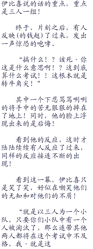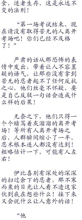 生存率百分之五十!?哈·别开玩笑了,理论永远只是理论!在场的所有人都希望剩下的人越少越好!所以自己就会尽可能多的抢夺苦无!而自己抢的越多,那么考试及格的人数就会越少,到最后竞争的人就会越少,那么自己晋升中忍的可能性就越大!