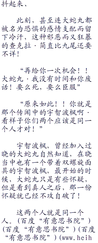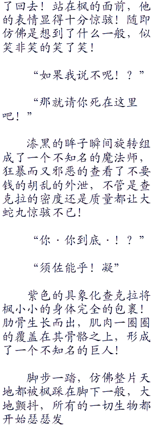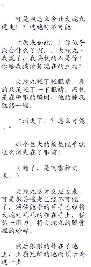 背后,立即响起了小樱的叫声,鸣人在一旁已经晕倒了,佐助在刚刚和大蛇丸的战斗中也受了重伤!小樱已经吓得不行了,可是现在却看到枫从天而降的救了他们!