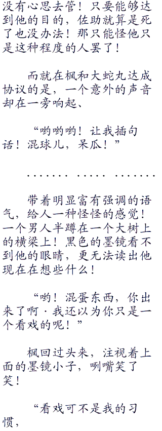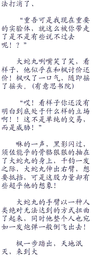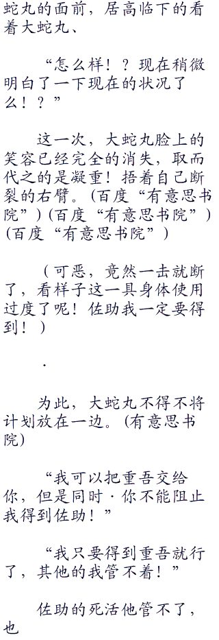 “族人和兄弟是两回事!你的话还是这么多呢!大蛇丸!身为晓的一员,我有多到数不清的条件让人走不出这个森林!”