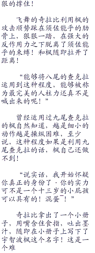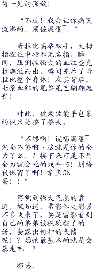 收回了千本樱,既然对方不打算用剑来解决问题的话,那自己使用剑的话,就太欺负人了啊!现在枫的剑,哪怕是奇拉比把八尾直接叫出来,也能够把它给砍了、