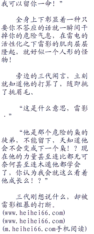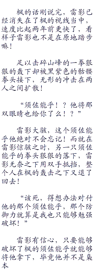 三代来还来不及感叹,雷影便是一步踏出,全身包裹着危险的雷电外衣,一步之下,地面崩溃,好似洋溢着山崩地裂的气势、