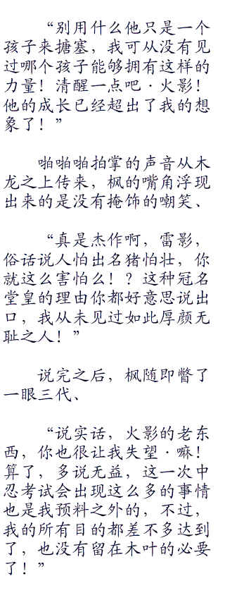 倒不如说,正是因为雷影说着这种让奇拉比在意的才让眼前的一切发生的吧,不过论最大的责任的话,还是抱着玩一玩心态逃出村子的奇拉比,看雷影和怒目而视的目光,就可以猜出在这之后奇拉比绝对会遭受到地狱般的惩罚!这让眼前这个被束缚的牛头怪物露出了本不应该露出的恐惧表情!能够将这个最完美的人柱力教训得服服帖帖的,也就只有身为他大哥的雷影吧!?