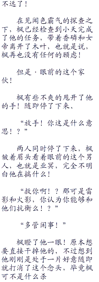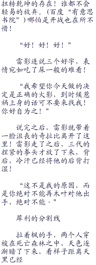 三代冷冷的看着雷影,瞳孔之中闪烁着坚定,雷影看到的是绝对无法挽回的信念!