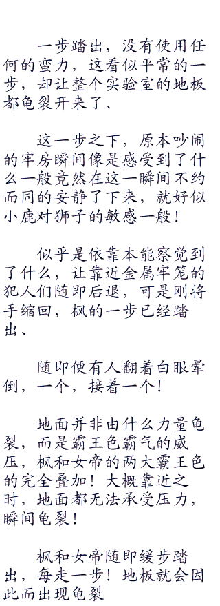 “我走了之后,犯人们便经常引发暴动,有些甚至破坏了牢笼跑了出来,我回来的时候也花了好多力气才将他们一一抓回来,虽然有我在他们暴动的次数变少了,但是也时不时的会发生!!”