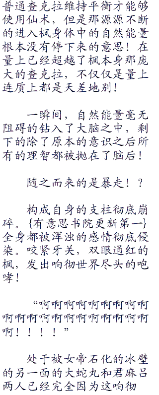 清爽之感从小腹的地方传出,流遍全身的每一个角落!全身上下所有的细胞好似都被激活了一般!有一种蠢蠢欲动的错觉!透过现在自己身上的每一寸皮肤,枫甚至可以感受到大气当中那磅礴的自然能量!那毫无疑问就是仙术查克拉。