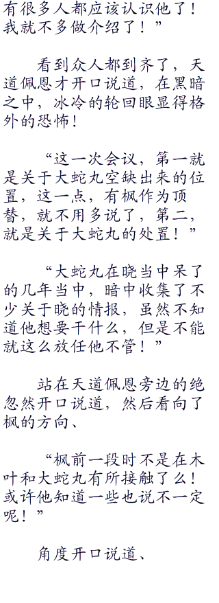枫去下斗笠,换股着现有的晓的成员,每一个人都是他熟悉的家伙,虽说有些和两年前有些差别,但是变化都不是很大!