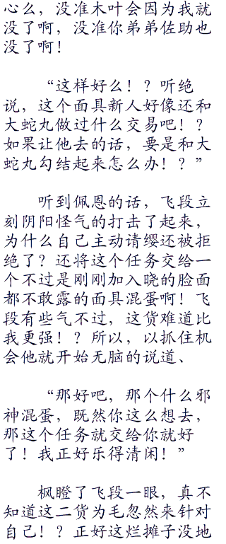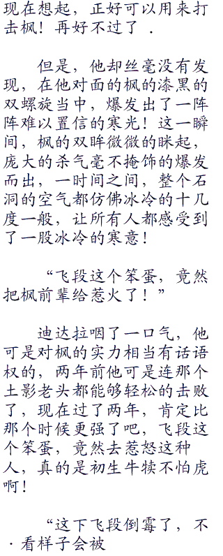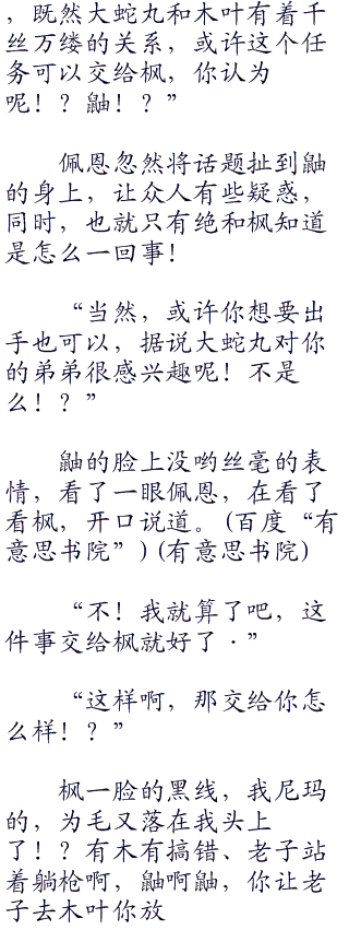 枫咽了一口水,这大蛇丸还真尼玛算是一个人才,竟然调拨了雷影和火影的关系,枫估计雷影和火影在中忍考试上就有摩擦了,毕竟当初枫自己和把奇拉比给打趴下了,最后却没有一个人来抓自己,按照雷影的性格,枫把他弟弟“六四七”干趴下了,他不得跳到天上去了!?结果这件事却不了了之,很可能被火影给压下来的。