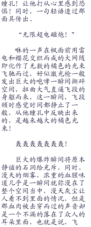 飞段的话刚一说完,一道疾驰而过的金色的光束咻的一声飞掠而过,瞬间穿透了飞段那正大笑着的嘴巴,灼热的高温使得伤口一瞬间凝固,散发着被灼烧的肉香味道,穿透了他的后脑勺,留下了一个拳头大小的窟窿!
