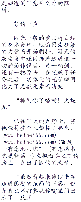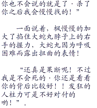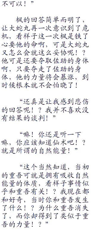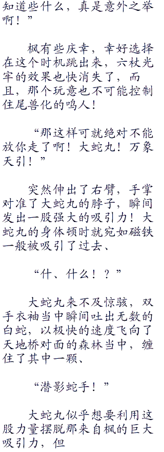 你妹的,大蛇丸已经在内心骂了枫无数次了,象征性的走一趟!?你蒙谁呢!?必须要想一个办法,不然今天就得交代在这里了!虽说大蛇丸对他自己的忍术有很大的自信,但是在枫的面前,他的自信还真的没剩下多少了!
