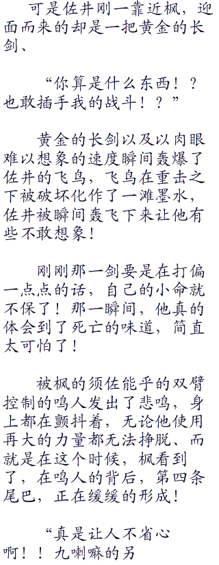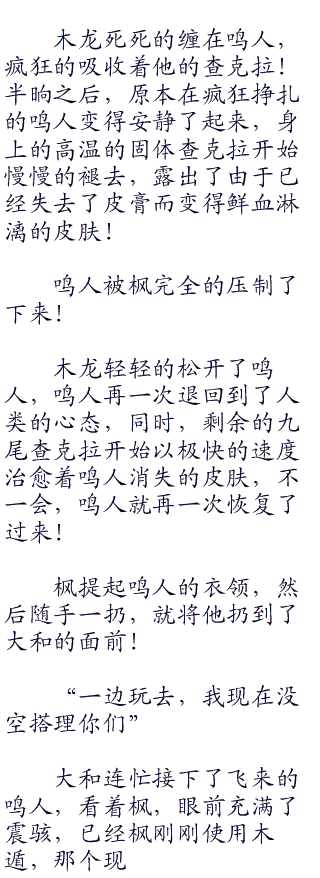 吐出了大量的鲜血,鸣人的背后响起了骨骼破碎的声音!肋骨不知道几根被枫给踩碎了、