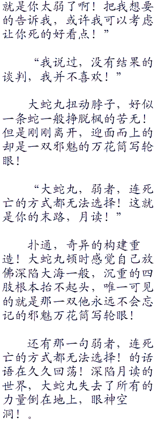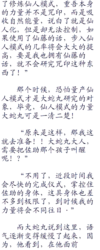 “我知道了,大蛇丸大人,不过,我很好奇,那个戴面具的人说什么抑制自然能量的什么东西,大蛇丸大人您有这种东西么!?”