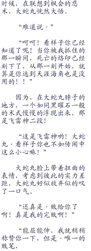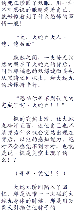 想想大蛇丸都觉得有些好笑!试问,如果三年以前,枫想要杀了大蛇丸的话,恐怕大蛇丸已经不知道死了多少次了!而今天能够从天地桥逃出来,完全是因为身为九尾人柱力的鸣人暴走的缘故!不然大蛇丸自己不认为他逃得了!