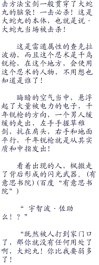 大蛇丸露出凄美的笑容,他恐怕知道今天已经逃不了了,旁边的兜看到正想出手,一个黑影随即挡在了他的面前。
