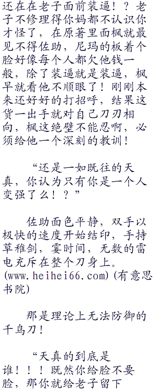 佐助面对着枫,没有丝毫的犹豫,草稚剑架在枫的脖子上,似乎随时都有可能落下!在三年前,枫轻易击败佐助的事情,他现在都还记得,但是现在已经今非昔比了,佐助不认为现在的自己什么地方比枫弱!