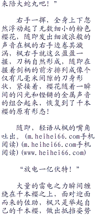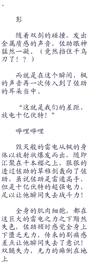 枫突然出现在他的旁边,让佐助大惊,他自认为自己的速度已经很快了,但是和现在的枫比起来,根本不是一个级别的,惊骇之间,佐助瞬间做出反应、全身上下释放出了大量的雷电、