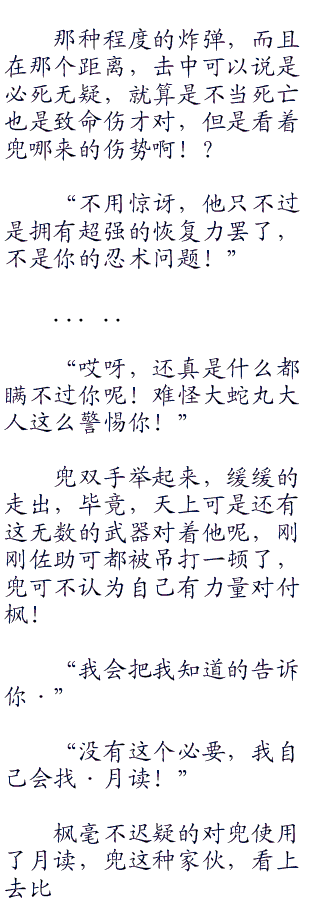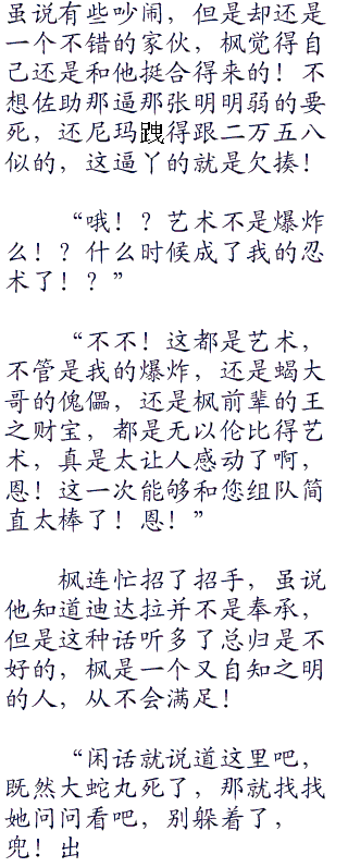 想到这里,枫看了看迪达拉,看样子佐助凭借这一招逃过一劫呢!还是太过于孩子气了,这种程度就像要了佐助的命,看样子似乎有些想的太过于自然了点!